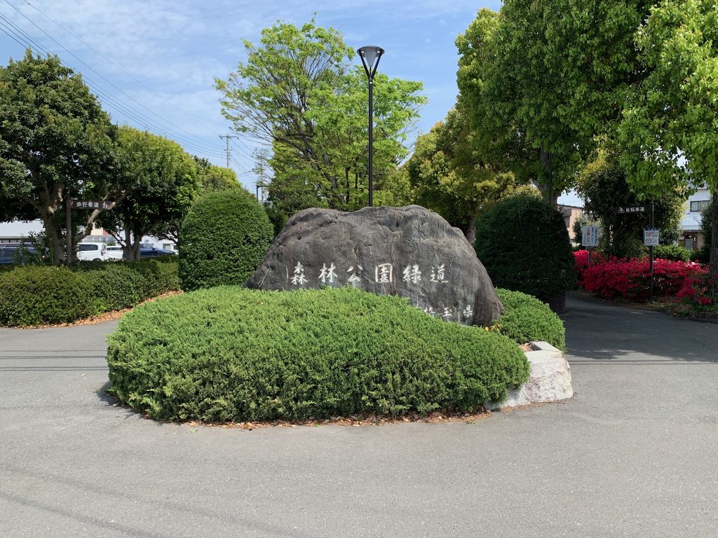 ロータリー正面の信号を渡った先に「森林公園緑道」と書かれた石があるので、この道行きます。